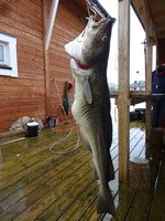 Endlich am dritten Tag war es soweit. Das Wasser war so glatt wie die Plastikfolienozeane, die es früher bei der Augsburger Puppenkiste gab. Also ab ins Boot und die Schifffahrtswege entlang raus aufs Meer. Nach 1 1/2 h erreichten wir die ersehnten Plateaus und ließen gespannt unsere Köder hinab. Und es dauerte nicht lange da ging der Tanz los. Offenbar waren wir im Eldorado der Großdorsche, für das Vega bekannt ist. Ein Dickdorsch von weit über einem Meter eröffnete den Reigen und wurde von Anton per Kiemengriff an Bord gehievt.